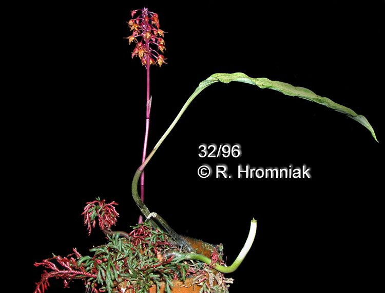 Found in Yunnan province of China, Nepal, Malaysia, Sumatra, Java, Sulawesi, Borneo, the Philippines and New Guinea in dark spots in forests with lots of rich soil with humus at elevations around 1100 to 1900 meters as a medium sized, warm growing terrestrial with a creeping rhizome carrying a tall cylindrical pseudobulb with a single, apical, plicate, oval, obtuse leaf which gradually narrows into a 8" [20 cm] long, purple stalked, petiole that blooms in the spring on a basal, 8" [20 cm] long, densely many flowered inflorescence enveloped basally with several, tubular to acuminate bracts and dark purple, narrow, reflexed, floral bracts that come over the ovary and holding the Bulbophyllum-like, foul smelling [chicken feces] flowers towards the apice