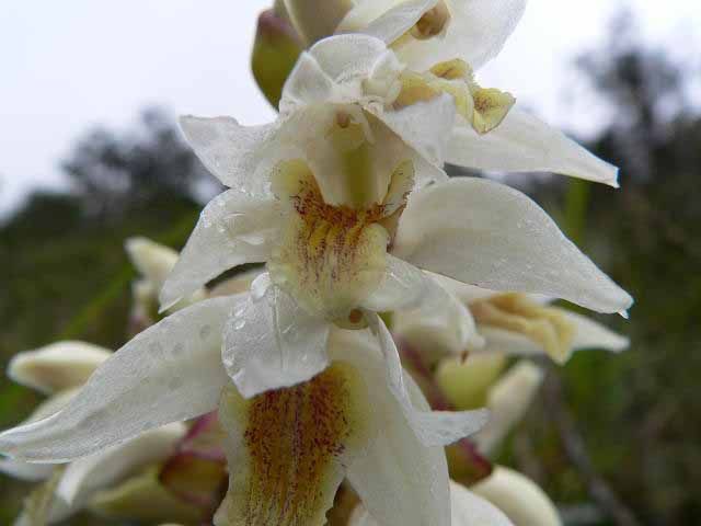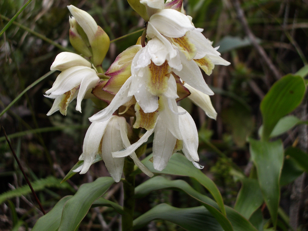Found in Borneo in hill and lower montane forests among limestone boulders at elevations around 600 to 1800 meters as a large to giant sized, warm to cool growing terrestrial or epiphyte with several leafy, noded stem carrying bifarius, oblong-ovate, long-acuminate to acute, shortly contracted below into the base, coriaceous, glossy above,dull beneath leaves that blooms in the late spring later summer and in the mid fall on a terminal, paniculate, 5 to 7 branched, each branch 1.6 to 2" [4 to 5 cm], in total length to 3.6" [9cm] long, spreading, slightly curved, to 10 flowered inflorescence with bracts subtending branches, cymbiform, clasping, concave, acute to shortly acuinate, persistent brown bracts and cymbiform, concave, semi-ovate, shortly acuminate to conical-apicaulate, densely punctate, many nerved, cream to brown colored floral bracts and carrying slightly sweet scented flowers