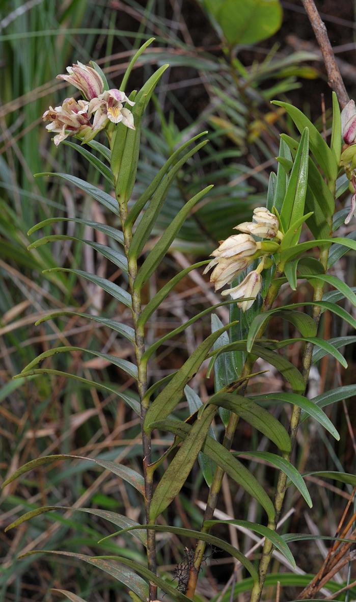Found only in Borneo in lower to upper mossy, montane forests at elevations of 1300 to 2600 meters as a small to large sized, warm to cold growing, monopodial, terrestrial or epiphytic orchid with a creeping, branching rhizome giving rise to slender, erect, rigid stem enveloped basally by persistent leaf sheaths and carrying disitichous, spreading, linear, basally narrowing, obtuse or minutely unequally bilobed apically, rigid, thick, coriaceous, slightly revolute margins, carinate below leaves that are articulate to the leaf sheaths below that blooms at any time of the year on a terminal, unbranched, pendant to reflexed, 3 to 7 flowered, .4" [1 cm] long, fractiflex inflorescence with broadly ovate, cymbiform, conduplicate, dorsally carinate towards the apex, subacute to acute floral bracts that envelope the pedicel and ovary and carry slightly, sweetly scented flowers