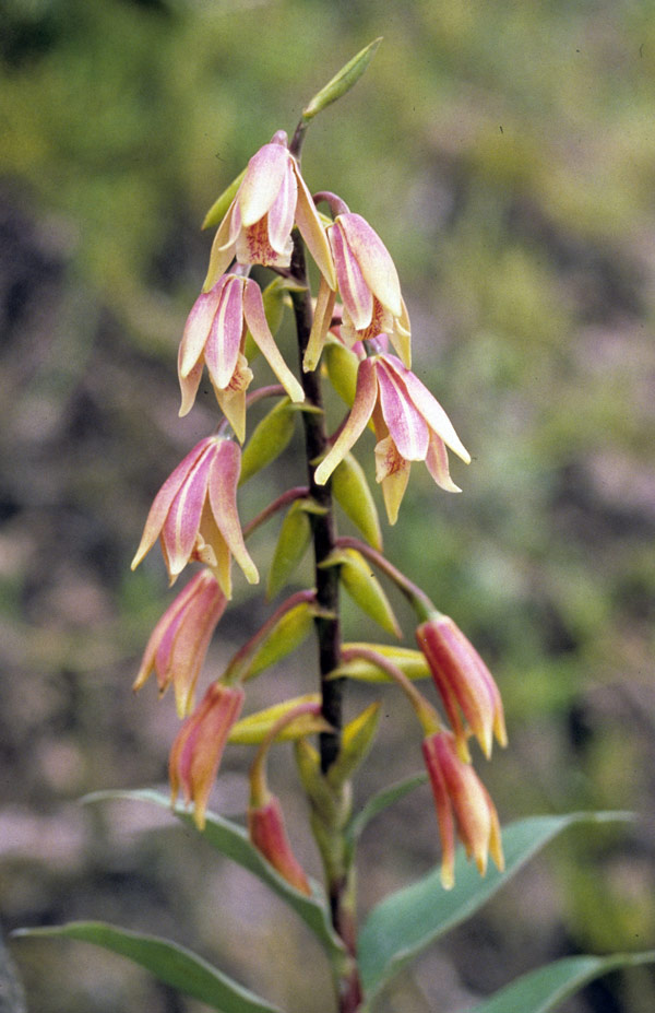 Found in Thailand, Malaysia, Java, Borneo, Moluccas, Sumatra and New Guinea in hill and montane forests often on rocky banks in full sun at elevations of 170 to to 2000 meters as a giant sized, hot to cool growing epiphyte or terrestrial with an elongate stem carrying 2-ranked, lanceolate, acute, upper smaller than lower leaves that blooms in the spring on a terminal raely branched, 6" [15 cm] long, to 10 flowered, inflorescence with long-oval, avute, very concave floral bracts.1" [2.5] cm between each flower