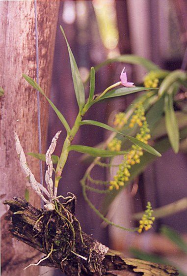 Found from Mexico, Belize, Guatemala, El Salvador, Honduras, Nicaragua, Costa Rica, Panama, Colombia, Venezuela, Guyana, Surinam, French Guiana, Trinidad and Tobago and Brazil in rain forests at elevations of sea level to 800 meters as a medium sized, hot to warm growing epiphyte with cylindric, furrowed stems enveloped by numerous, basally clasping and conduplicate, distichous, articulate, elliptic-lanceolate, coriaceous, apically unequally bilobed leaves that blooms in the summer and fall on a terminal, fasciculate, sessile, 1 to 1 1/4" [2.5 to 3 cm] long, successively flowering, racemose inflorescence.