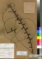 Found in Ivory Coast, Liberia, Nigeria, Cameroon, Equatorial Guinea, Gabon and Zaire at lower elevations as a medium sized, hot growing monopodial epiphyte with elongate stems carrying distichous, narrowly linear-oblong, unequally bilobed apically leaves that blooms in the fall on 2" [5 cm] long, few flowered inflorescence with very small white flowers