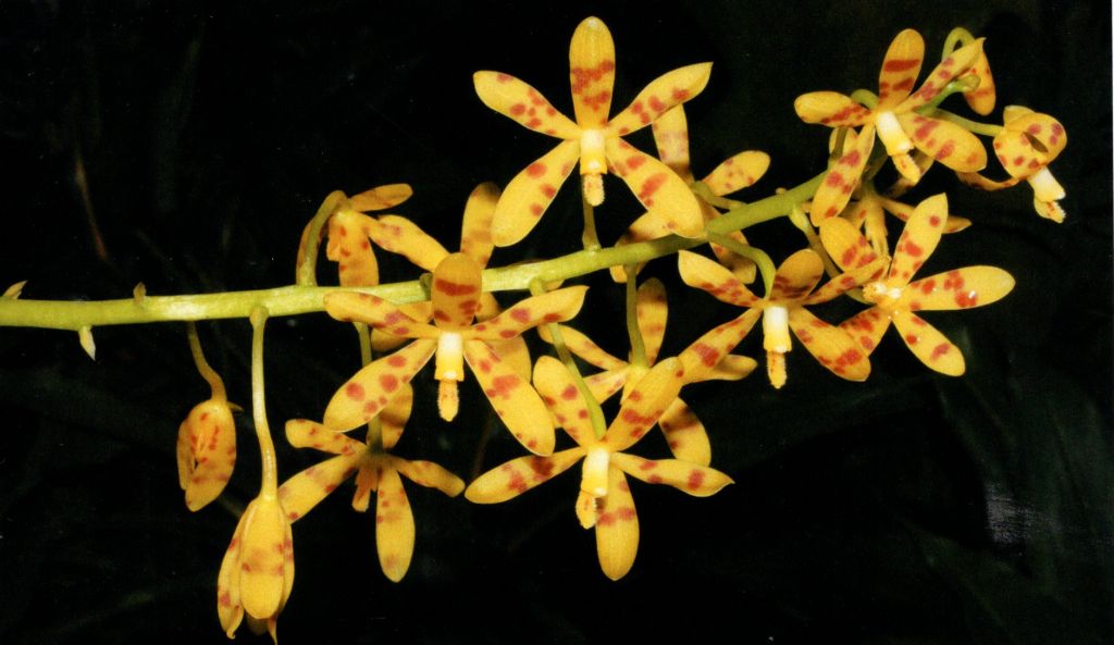 Found in western New Guinea in lowland forests at elevations of 20 to 200 meters as a large sized, hot growing terrestrial orr scrambling herb with monopodial, leafy in the upper half stems carrying spreading, tapering to an acute apex, 3 main ribbed leaves with overlapping, erect, green, persistent sheaths that blooms in the spring and summer on an erect, much longer than the leaves, peduncle 4 to 6" [10 to 15 cm] long, provided with 2 to 3, triangular scales, rachis cylindrical, 6.8 to 10" [17 to 25 cm] long, 10.8 to 16" [27 to 40 cm] long overall, to 35 flowered inflorescence.