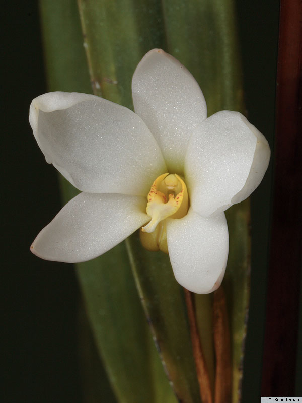 Found New Guinea at elevations of 1500 to 2000 metrs as a large sized, warm to cool growing epiphyte with basally swollen, tapering towards the apex, 12" [30 cm] long, pseudobulbs carrying a single, apical, erect, elliptic-lanceoalte leaf that blooms in the late spring through summer on a swhort, successively 1 to 2, few flowered inflorescence.