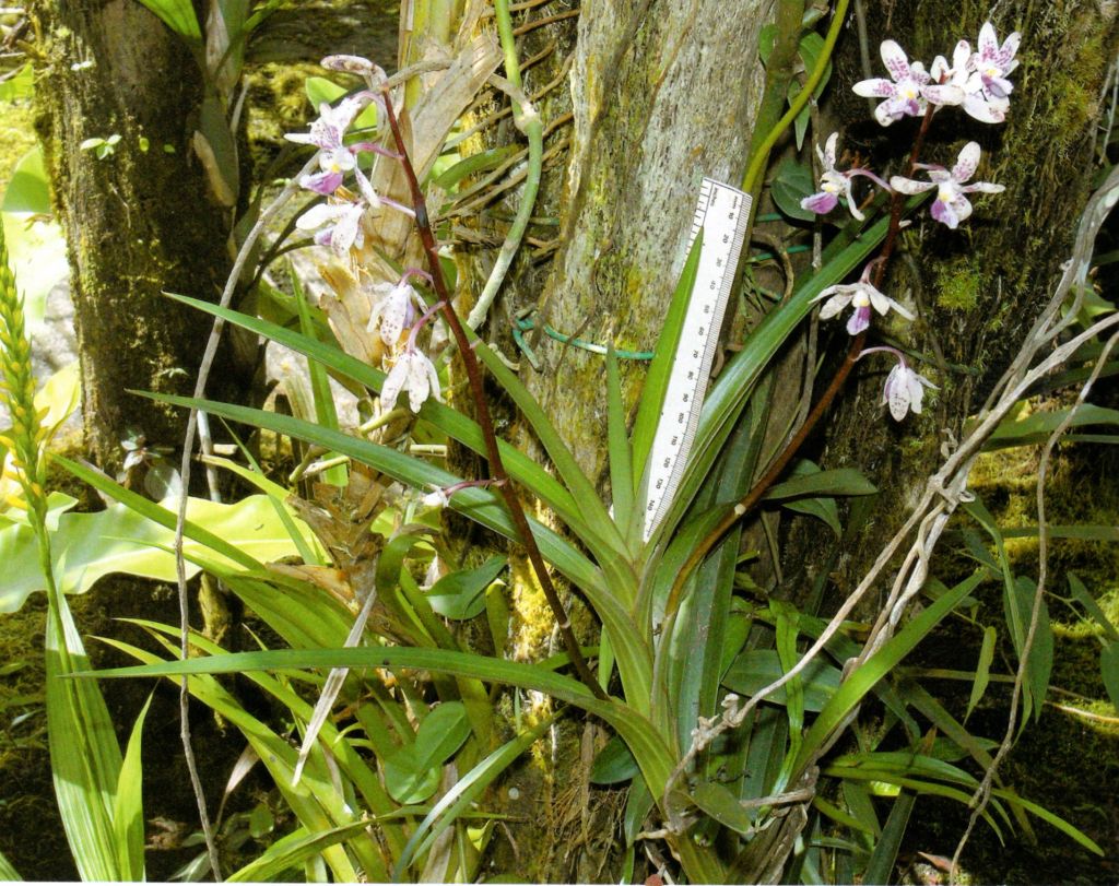 Found in Borneo in hill forests, heath forests, ridge top Bamboo forests and lower montane forests at elevations of 450 to 1370 meters as a giant sized, hot to cool growing terrestrial or climbing/scrambling herb with a monopodial, woody, slightly compressed, leafy throughout stem carrying spreading, tapering from a broad conduplicate base to an acute apex, 3 main ribbed leaves with overlapping, distally spreading, olive green to green, persistent sheaths that blooms in the late spring through earlier fall on an erect, shorter to slightly longer than the leaves, peduncle 4 to 5.6" [10 to 14 cm] long, provided with 3 to 4, green to maroon, distant scales, rachis cylindrical, 1.2 to 4.8" [3 to 12 cm] long, to 13 flowered inflorescence with tightly clasping, ovate, obtuse, purple to maroon or brown, much shorter than the ovary floral bracts and carrying nonfragrant flowers.