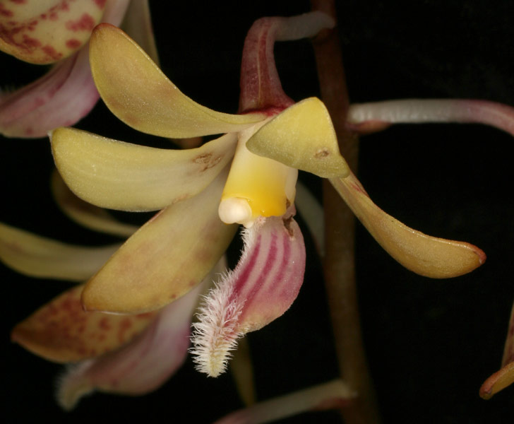 Found in penninsular Malaysia, Sumatra, Mentawai Islands, Borneo and Sulawesi in swampy situations near rivers at elevations of 50 to 600 meters as a giant sized, hot to warm growing terrestrial or scrambling/climbing herb with monopodial, leafy throughout stems carrying suberect, spreading, to archig, strap-shaped, canaliculate, gradually flattening and tapering to an acute apex, 3 main ribbed, with an additional 2 minor ribs in proximal half, green leaves that blooms in the spring summer and fall on a suberect, arching to drooping, subequal to longer than the leaves, peduncle 4 to 12" [10 to 30 cm] long, provided with 2 to 3 distant scales, sometimes shortly single, 1.6 to 2" [4 to 5 cm] long, 5 flowered branch, at base of rachis, rachis 1.6 to to 12" [4 to 30 cm] long, loosely 4 to 7 flowered inflorescence with tighly clasping, ovate, obtuse, much shorter than the ovary floral bract and carrying smetimes strongly fragrant flowers