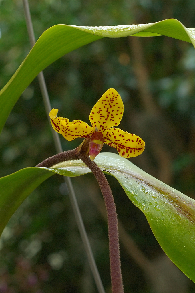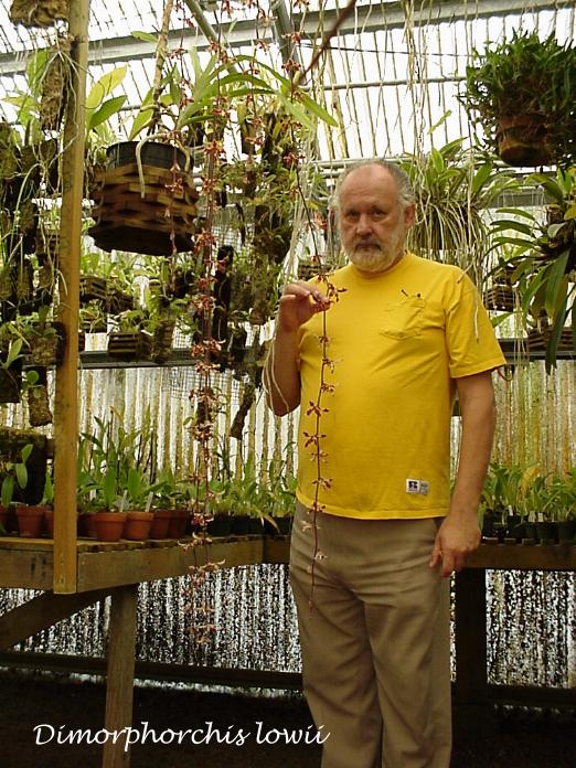 This monopodial, large sized, hot to warm growing, epiphytic species is found in Borneo, especially Sarawak in hill and lower montane forests in gullies and ravines in tall trees often overhanging water at elevations of sea-level to 1800 meters with long pendant, stout, stems carrying ligulate, unequally bilobed at the apex leaves that are articulated to the sheathing leaf base and blooms in the fall and early winter on a pendant, to 12' [to 360 cm] long, laxly many flowered inflorescence with lanceolate bracts and has two distinctly different flowers on the same inflorescence. The basal flowers are strongly fragrant, are yellow with purple spots, with hairs on the outer surface, 2" tall and 2 2/5" across, and has the sepals and petals overlapping. The apical flowers have yellow with large, maroon blotches, 2 2/5" tall and 2 1/2" across, with the sepals and petals separated and having undulate margins as well as being hairy on the outer surface.