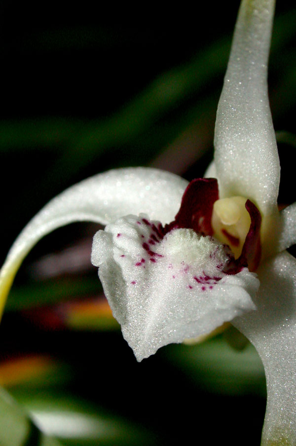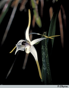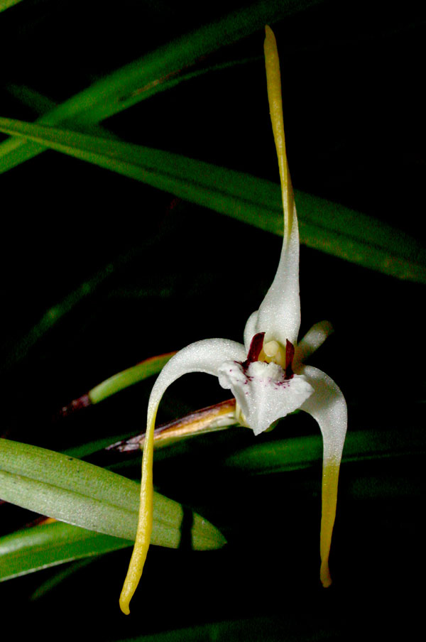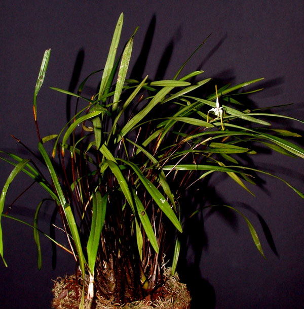 Found in the Moluccas, Bismark Archipelago and New Guinea in swamps, savannahs, rainforests and hill forests at elevations of sealevel to 400 meters as a small sized, hot growing epiphyte with crowded, basally oblong-ovoid, apically slender and angular pseudobulbs carrying a single, apical, erect, coriaceous, linear, bilobed, concave on either side of the convex mid vein, weakly keeled beneath leaf that blooms in the late summer through early spring on a terminal, successively single flowered inflorescence arising through a laterally flattened, narrow, acute spathe.