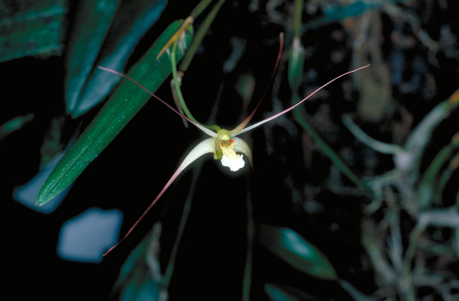 Found in New Guinea on trees at elevations between 1000 to 1100 meters as a small sized, cool growing epiphyte with slender, basally sightly swollen, ancipitous, straw yellow pseudobulbs carrying a single, apical, erect to suberect, subcoriaceous, glabrous, linear, obtuse, unequally bilobed apically leaf that blooms in the spring and summer on an apical, acute, compressed, .6 to .68" [1.5 to 1.7 cm] long, successively single, few flowered inflorescence.