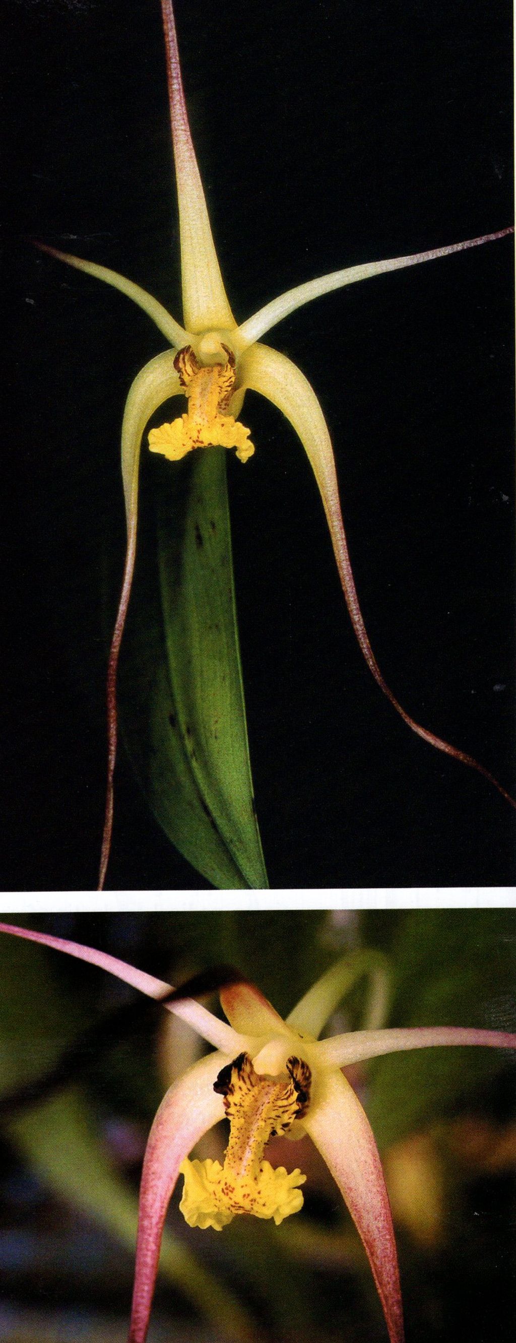Found in Malaysia, Sumatra, Borneo and New Guinea in lowland mangrove swamps as a small to medium sized, hot to warm growing epiphyte with a a very short rhizome, giving rise to clustered, slender, flattened, broadest near the base pseudobulbs carrying narrowly lanceolate, minutely bilobed apically leaves that blooms in the fall on successively 2 flowered inflorescence,with a basal bract.