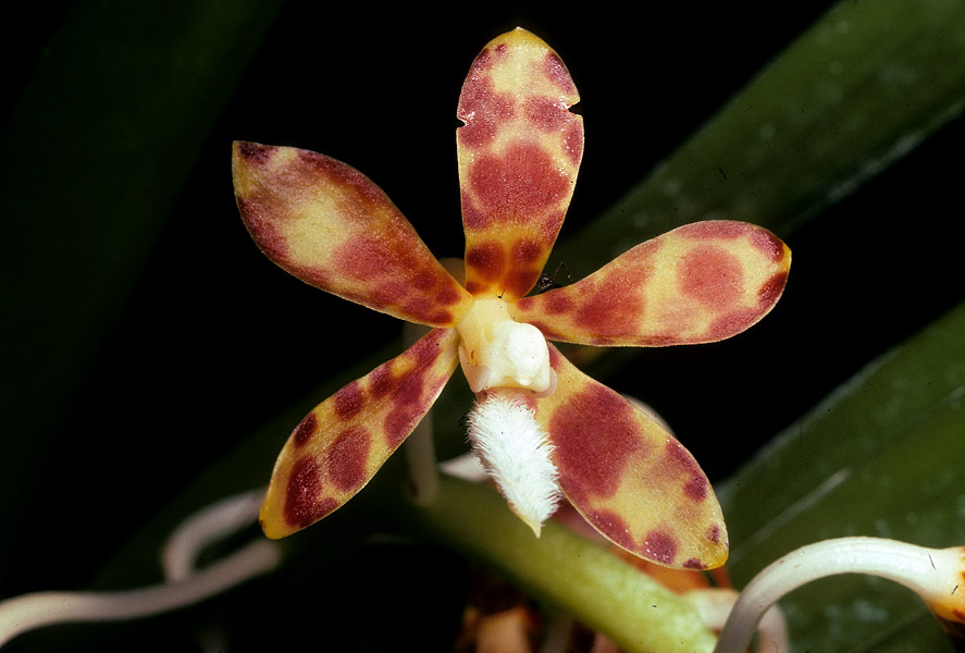 Found in penninsular Malaysia and central Sumatra as a hot growing terrestrial with long, climbing stems carrying closey 2 ranked, with overlapping bases, curving outwards strap-shaped leaves that blooms on an erect, to 8" [20 cm] long or more, rachis to 10" [25 cm] long, to 18 flowered inflorescence