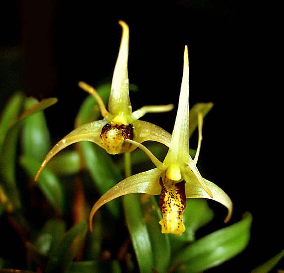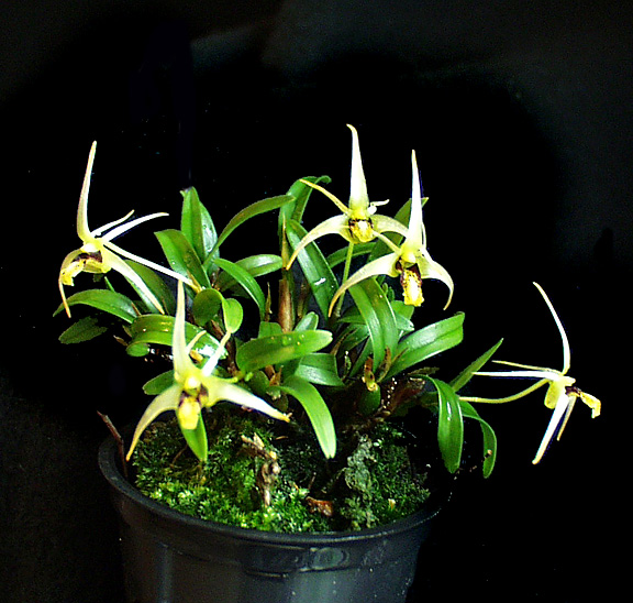 Found in New Guinea in lowland rainforests as a mini-miniiature sized, hot growing epiphyte with clustered, fusiform pseudobulbs carrying a single, sublinear, apically bilobed, grooved on the upper side along the midvein leaf that blooms in the summer on successive, terminal, .22" [.55 cm] long, single flowered inflorescence arising through a laterally flattened spathe.
