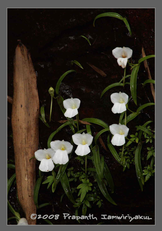 Found in the Chinese Himalayas, Assam, eastern Himalayas, Myanmar, Thailand and Vietnam in grassy areas of forests in deep shade at elevations of 600 to 2600 meters as a miniature to small sized, cool to cold growing terrestrial with ellipsoid tubers giving rise to 2, basal, 1 larger than the other, ensiform to linear-lanceolate, glabrous, contracted below into the amplexicaul sheath, acuminate leaves that blooms in the later summer on an erect, glabrous, 2.4 to 7.2" [6 to 18 cm] long, usually single flowered inflorescence with a broadly ovate, as long as the ovary floral bract