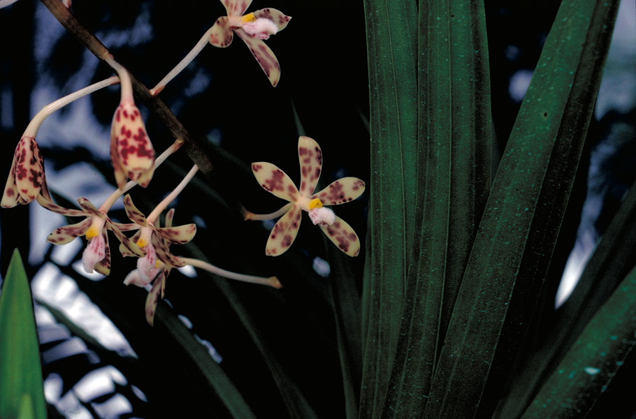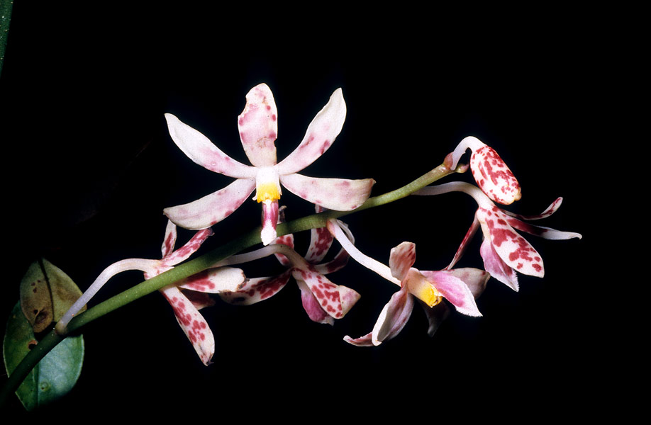 Found in Thailand?, Malaysia, Borneo, Java, the Philippines, Sulawesi, Bismark Islands, New Guinea, Solomon Islands and Queensland Australia in swamp forests, lowland forests and hill forests at elevations of 300 to 1400 meters as a large sized, hot to cool growing epiphyte with an elongate stem completely enveloped by leaf-bearing sheaths and carrying strap-shaped, close set, 2 ranked leaves that blooms in the summer on an axillary, to 16" [to 40 cm] long, 4 to 18 flowered inflorescence with sometimes non-resupinate flowers