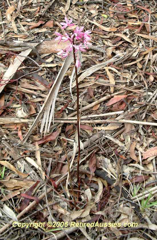Found as a large sized, cool to cold growing mycoheterotrophic, leafless terrestrial occuring in Queensland, New South Wales, Victoria and South Australia at elevations of 10 to 1100 meters in open forests and woodlands, drier ridges and river valleys and in coastal areas all in well drained soils with an erect stem that blooms in the summer and fall on an erect, reddish brown, to 3' [to 100 cm] long, 9 to 60 flowered inflorescence.