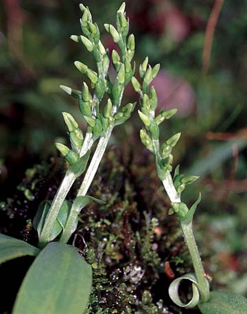 Found in the Chinese Himalayas, eastern Himalayas, Assam and Nepal on mossy banks in very moist, evergreen, broad-leaved forests at elevations of 1900 to 4270 meters as a miniature sized, cold growing terrestrial with an erect-curved, slender, glabrous stem with a bladeless basal, tubular sheath and carrying usually a single, narrowly elliptic-oblong, subacute to obtuse, tapering below into the petiolate base leaf that blooms in the larer summer and fall on an erect, .8 to 1.6" [2 to 4 cm] long, decurved, laxly 7 to 10 flowered inflorescence