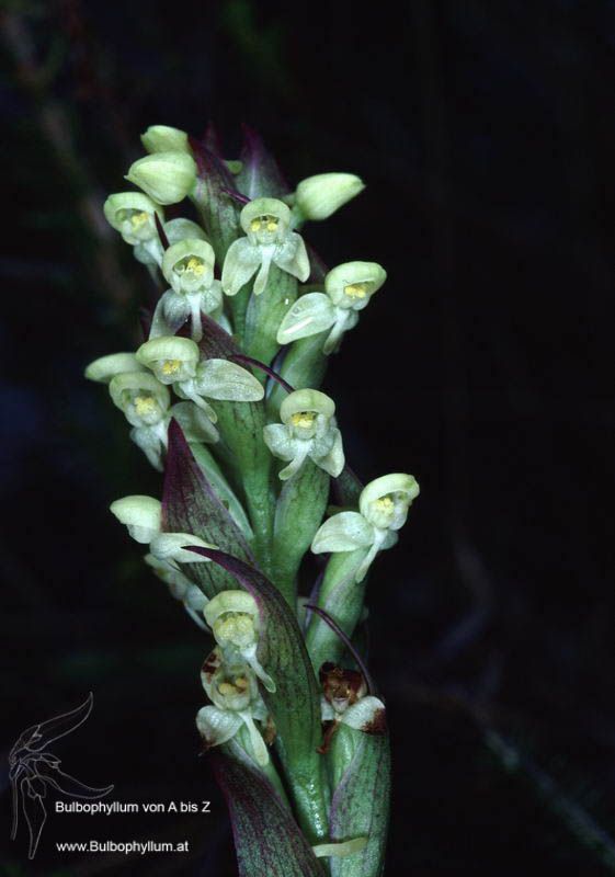 Found in southeastern Madagascar in montane eriaceous scrub at elevations of 2100 to 2400 meters as a medium sized, cold growing terrestrial with oblong tubers giving rise to an erect stem carrying 3 radical, narrowly oblong-ligulate, slightly attenuate towasrds the base leaves that blooms in the early summer on a terminal, erect, to 16.8" [42 cm] long, very dense, many flowered inflorescence enveloped by long sheaths with acuminate limbuses and lanceolate-acuminate, twice as long as the flowers floral bracts.