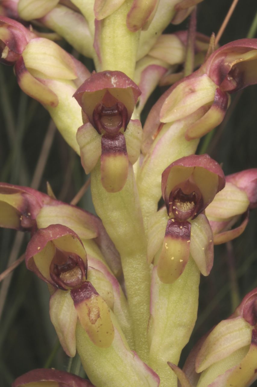 Found in Malawi, Zimbabwe, Madagascar, Lesotho, Cape Province, Natal, Orange Free State, Transvaal South Africa in montane grasslands at elevations 2000 to 2800 meters as a small to medium sized, cold growing terrestrial with a sterile shoot and an erect fertile shoot carrying numerous, imbricating, narrowly lanceolate to rarely narrowly ovate, acute, lower leaves largest ascending and grading smaller into the floral bracts and blooms in the later spring, summer and fall on a lax, cylindrical, 1.6 to 12" [4 to 30 cm] long, several to many successive flowering inflorescence.