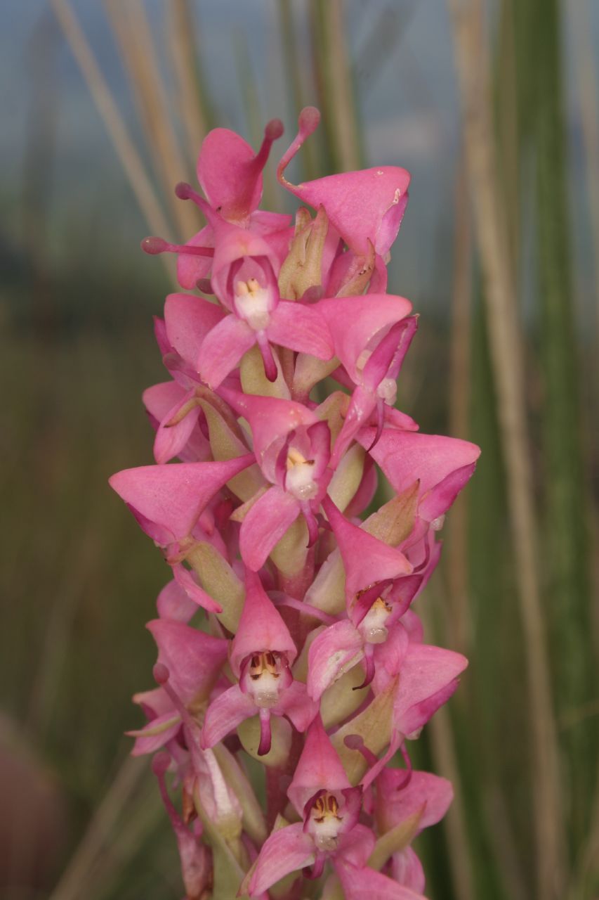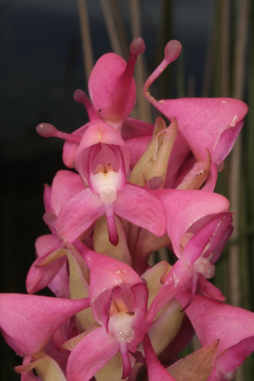Found in Transvaal South Africa in permanent vlei and on steep easterly slopes in damp, well drained grasslands at elevations of 1900 to 2300 meters as a small to medium sized, cold growing terrestrial with cauline sheathing leaves grading to bracts on the sterile shoot that blooms in the summer on an erect, densely 20 to 50 flowered inflorescence.