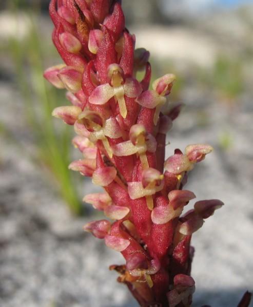 Found in southwestern Cape Province South Africa in dry to slightly moist sandy and gravelly soil at elevations of sea-level to 600 meters as a slender, beet-root red, mini-miniature to small sized, cool to cold growing terrestrial with that blooms in the spring on an erect, terminal, slender, cylindrical, densely many flowered inflorescence