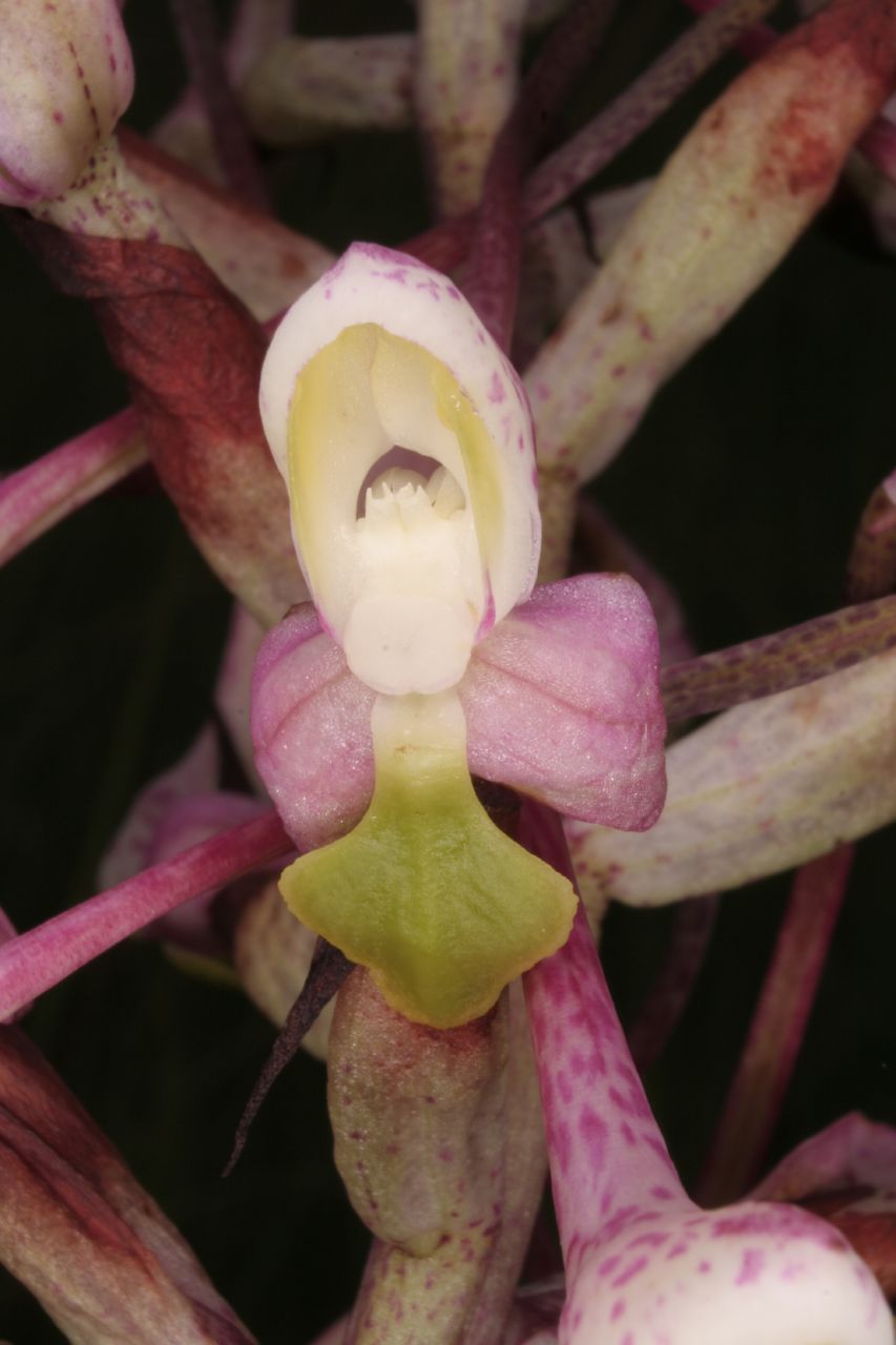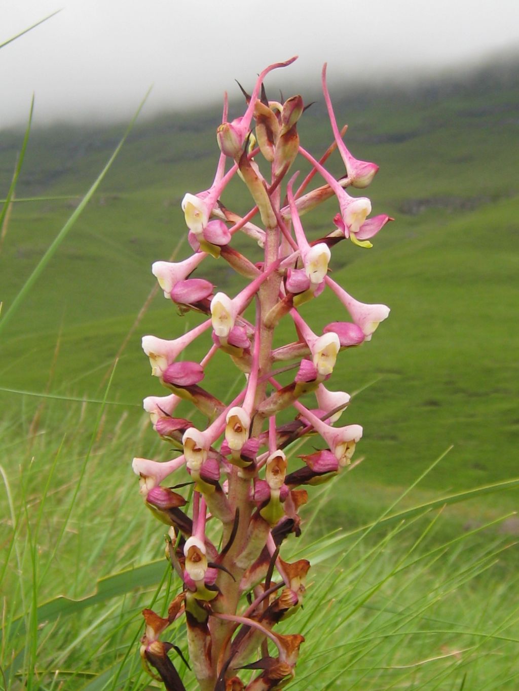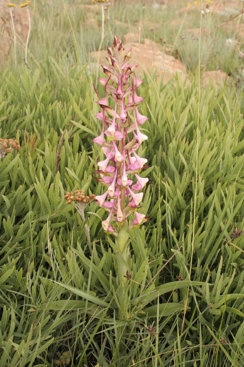 Found in Lesotho, Cape Province, Natal, Orange Free State and Transvaal South Africa in upland grasslands at elevations of 1800 to 2200 meters as a medium to large sized, cold growing terrestrial with 2 to 5 leaves on a sterile shoot and 6 to 15 cauline leaves on the fertile shoot that blooms in the late spring and early summer on an erect terminal, with an imbricate, 16" to 28" [40 to 70 cm] long, 20 to 50 flowered inflorecence with floral bracts that are longer than the ovaries and carrying soapy-clove scented flowers
