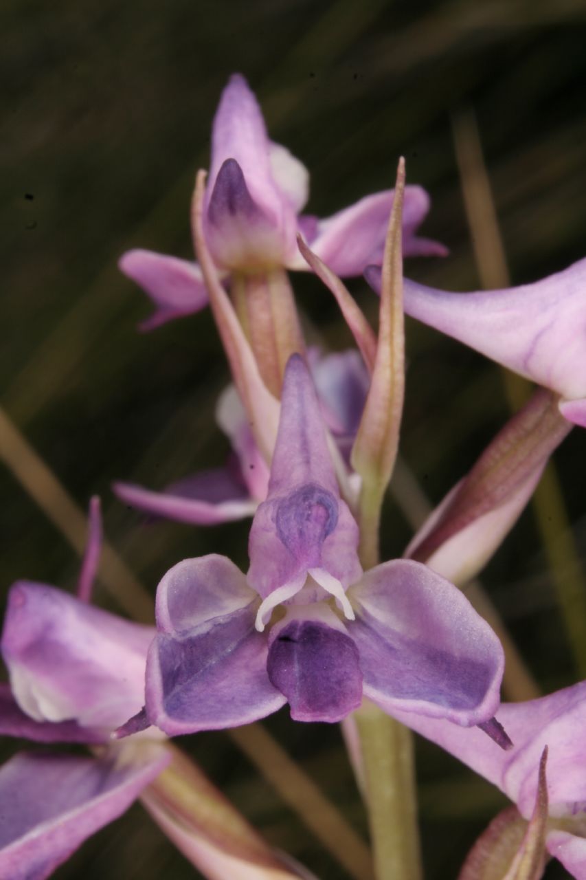 Found in Natal and Orange Free State South Africa on grassy slopes among rock and rocky soils at elevations of 2100 to 2900 meters as a medium sized, cold growing terrestrial orchid with kinear, rigid, erect leaves that blooms in the late spring and earlier summer on an erect, terminal, to 45 cm] long, laxly several flowered inflorescence.