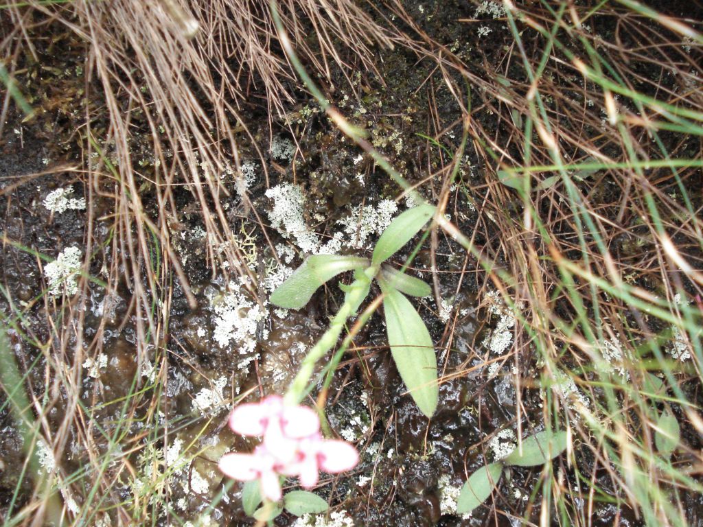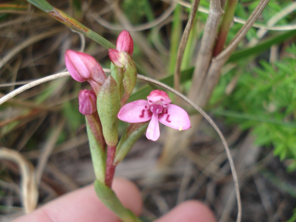 Found in southern Cape Province South Africa in wet moss and turf on rocks and in small crevasses at elevations of 600 to 1500 meters as a miniature to small sized, cold growing terrestrial orchid with 3 to 6 spreading, elliptic, imbricate leaves that blooms in the summer on a corymbose, 1 to 10 flowered inflorescence with bracts as long as the ovaries.