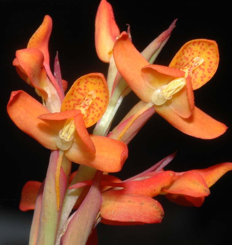 Found in central and southeast Madagascar in peat bogs at elevations of 1300 to 2100 meters as a medium sized, warm to cool growing terrestrial with oblong tubers giving rise to caulinar leaves that blooms in the spring and summer on a terminal, elongated, densely 7 to 15 flowered inflorescence enveloped completely by 12 to 14 sheaths and carrying floral bracts that are longer than the flowers.