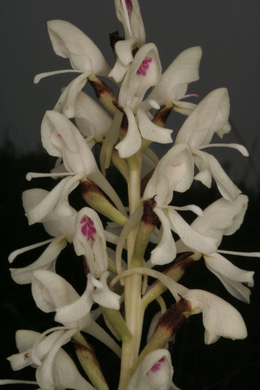 Found in Swaziland in dry stony grasslands in full sun at elevations 1200 to 1500 meters as a cold growing terrestrial with imbricate, narrowly lanceolate, shiney green above, paler below, glabrous, cauline leaves grading into the floral bracts on a fertile stem that blooms in the early summer on an erect, terminal, semi-densely many [24 to 30] flowered inflorescence carrying indistinct faintly scented flowers