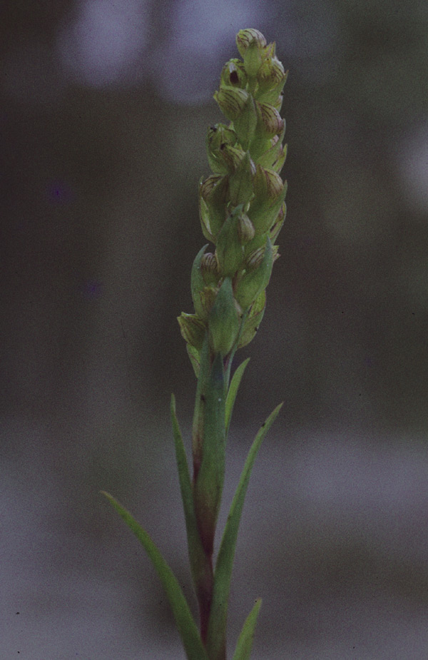 Found in southwestern Cape Province South Africa in mountains on rock ledges at elevations of 600 to 1200 meters as a medium sized, cool to cold growing terrestrial with narrowly lanceolate, cauline, erect leaves that blooms in the spring on an erect, 16" [40 cm] long, lax 3 to 20 flowered inflorescence
