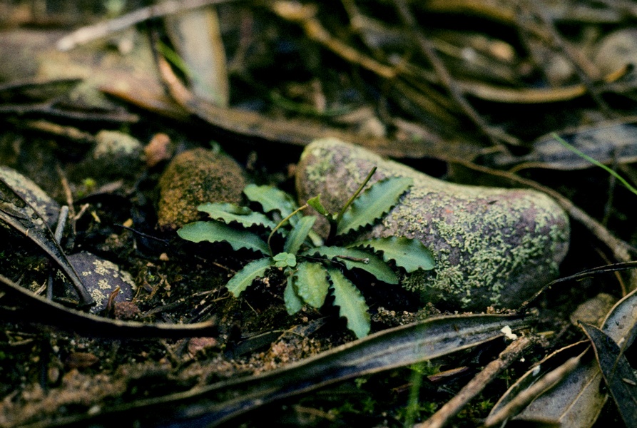 Found in southwestern Cape Province South Africa as a mini-miniature to small sized, cold growing terrestrial with a basal rosette of a few, elliptical, obtuse, wavy margined leaves that blooms in the later winter and early spring on a terminal, erect, 2.8 to 8 cm [7 to 20 cm] long, 2 to 8 flowered inflorescence nd carrying sweetly vanilla scented flwoers.