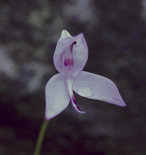 Found in southwestern Cape Province near streams on rock ledges and in crevices in mountains at elevations around 600 to 1200 meters as a sub-flexuous, small sized, cool to cold growing terrestrial with a basal rosette of elliptic, the rest cauline sheathing leaves that blooms in the spring on an erect, to 12" [to 30 cm] long, single flowered inflorescence.