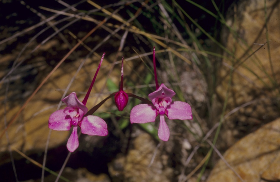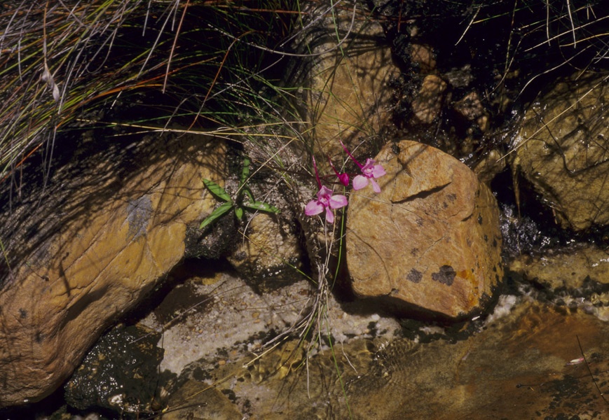 Found in southwestern and southern Cape Province rock crevasses near streams in mountains at elevations around 600 to 1200 meters as a small to medium sized, cool to cold growing terrestrial with a basal rosette of 3 to 10, elliptic, spreading, the rest lax, cauline sheathing leaves that blooms in the late spring and early summer on an erect, to 14" [to 35 cm] long, corymbose, 1 to 6 flowered inflorescence.