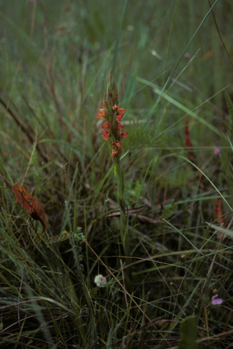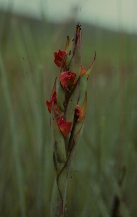 Found in Zaire, Tanzania, Malawi, Mozambique, Zambia and Zimbabwe in wet grasslands and river valleys at elevations above 1000 meters as a large sized, cool growing terrestrial with a sterile shoot carrying, oblanceolate-linear, acute, conduplicate leaves and a fertile shoot carrying imbricate to subimbricate, lanceolate, acute, closely sheathing cauline leaves that blooms in the late spring on an erect, to 28" [70 cm] long, subdense to dense, 5 to 40 flowered inflorescence