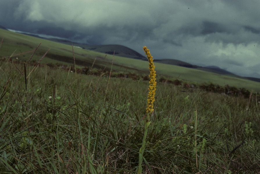 Found in Burundi, Cameroon, Congo, Rwanda, Zaire, Uganda, Kenya, Tanzania, Angola, Malawi, Zambia and Zimbabwe in montane grasslands at elevations of 1500 to 2600 meters as a miniature to large sized, cool to cold growing terrestrial with a sterile shoot with erect, acute, narrowly elliptic, conduplicate leaves and a fertile much taller, slender to robust, cauline, imbricate, acute to apiculate leaves that blooms in the spring through early summer on an erect, lax, 6" to 12" [15 to 30 cm] long, 50 to 200 flowered inflorescence