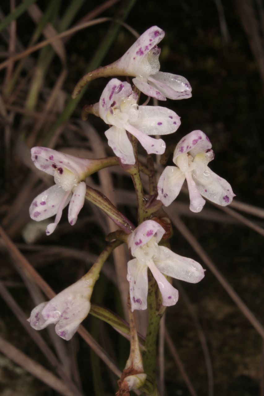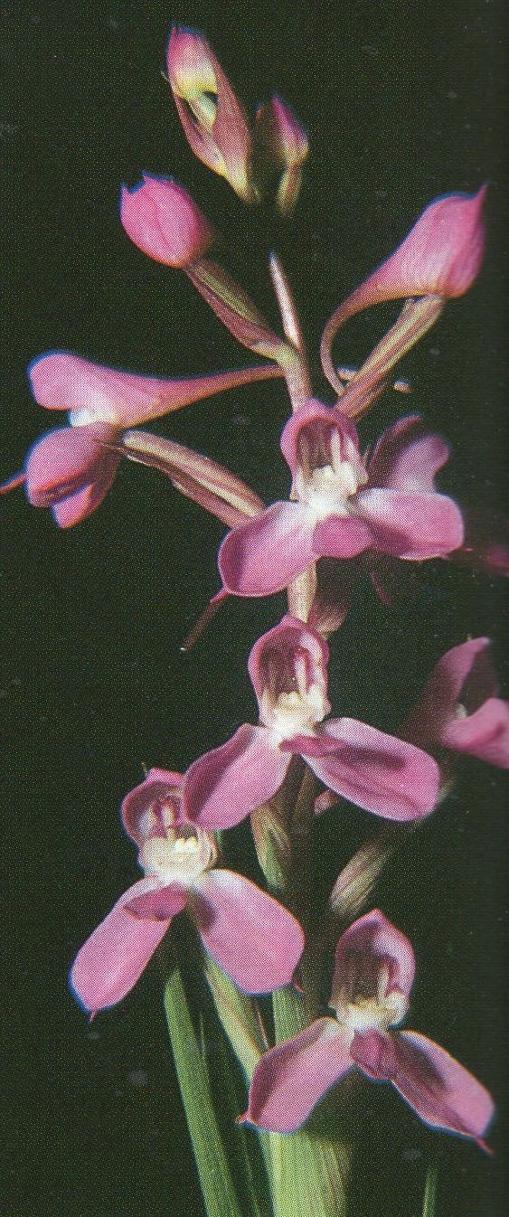 Found in Lesotho, Cape Province, Natal, Orange Free State and Transvaal South Africa in rock crevices and on ledges in partial sun at elevations of 1200 to 2700 meters as a medium sized, cold growing terrestrial orchid with flexuous, erect, rigid, linear, acute leaves grading into bracts that blooms in the late spring and early summer on an erect, terminal, to 14" [35 cm] long, laxly several flowered inflorescence
