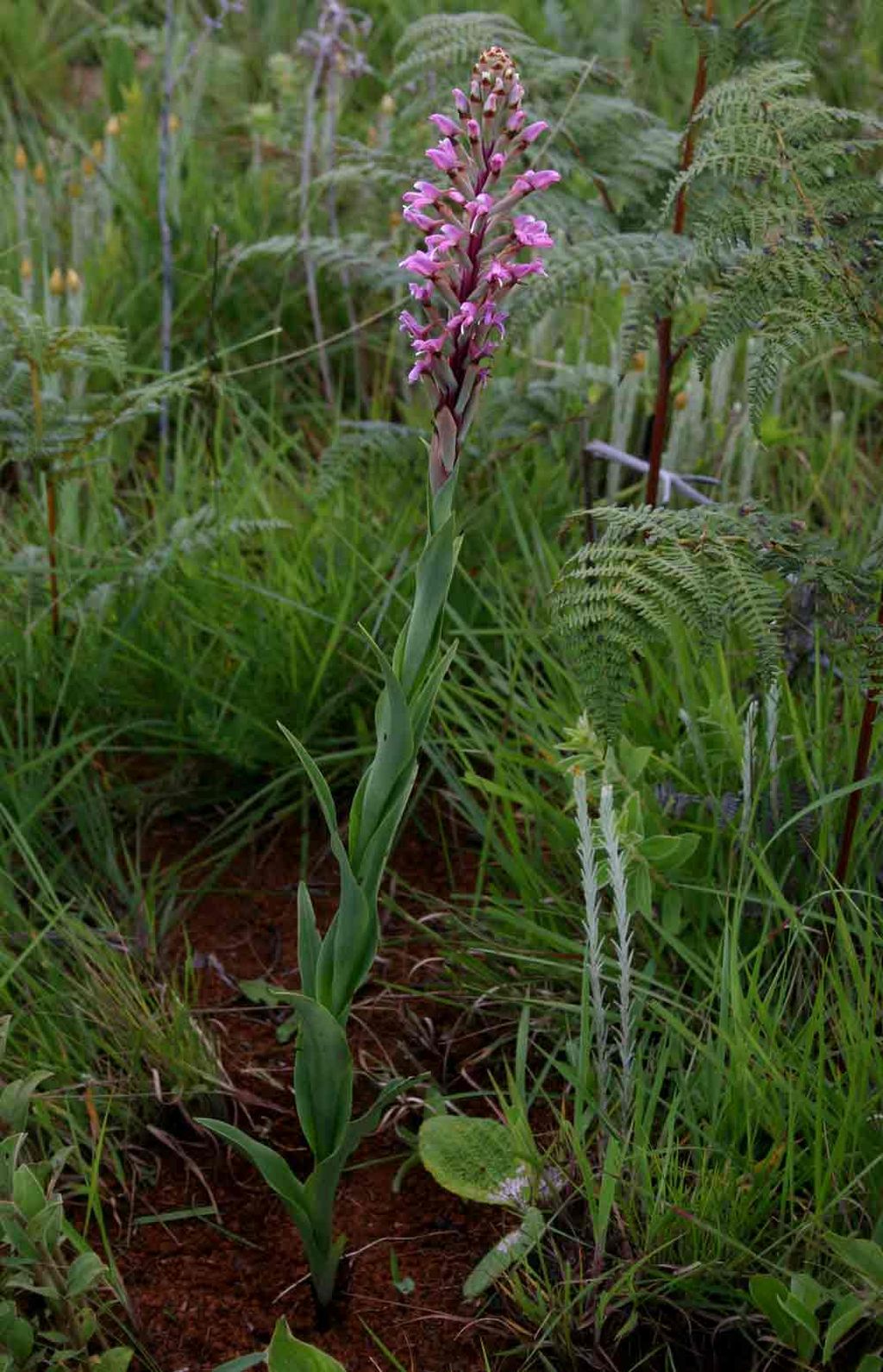 Found in Zimbabwe, Cape, Natal, Orange Free State and Transvaal South Africa as well as Swaziland in montane grasslands at elevations up to 2400 meters as a medium sized, cold growing terrestrial orchid with testicular tubers giving rise to an erect fertile stem carrying imbricating, lanceolate, acute leaves that blooms in the late spring on an erect, slender, terminal, 2 to 10" [5 to 25 cm] long, many flowered inflorescence.