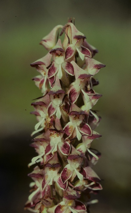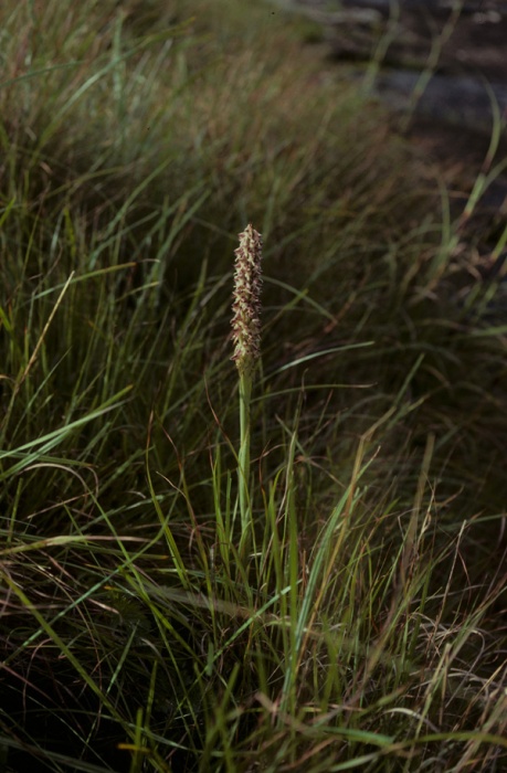 Found in Nigeria, Kenya, Tanzania, Malawi, Zambia, Zimbabwe and Transvaal South Africa in wet grasslands as a medium to large sized, warm to cool growing terrestrial with imbricate, cauline, lanceolate, acute leaves that blooms in the late spring and early summer on an erect, terminal, to 10" [to 25 cm] long, cylindric, densely many flowered inflorescence with narrowly ovate to lanceolate, acuminate, exceeding the flowers floral bnracts