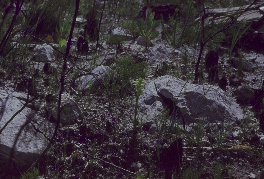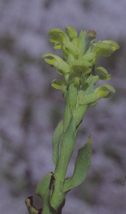 Found in southwestern Cape Province South Africa in sandy areas near the coast in full sun at elevations around 300 meters as a miniature to small sized, cool growing terresrial with undulate margined leaves that blooms in the spring on an erect, terminal, obovate,, to 8" [20 cm] long, densely several flowered inflorescence,