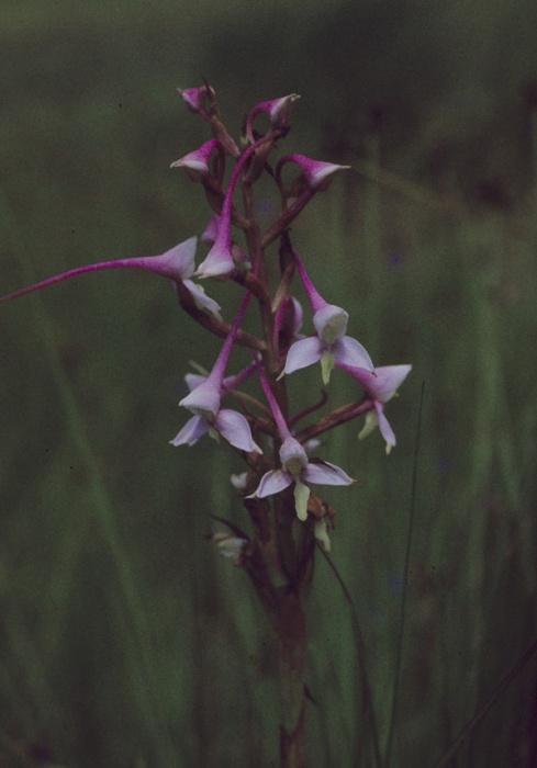 Found in S Cape Province and Natal South Africa, in swamps in full sun at elevations of 1500 to 2000 meters as a medium sized, cold growing terresrial that blooms in the late spring and early summer on an erect, terminal, to 20" [ to 50 cm] long, 10 to 20 flowered inflorescence,