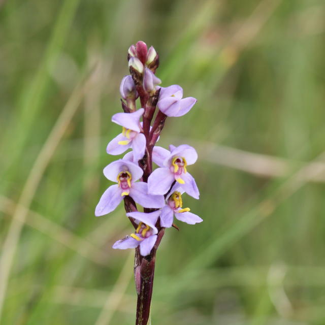 Found in Angola, Zambia and Natal South Africa in wet dambos at elevations around 1400 meters as a small to medium sized warm to cool growing terrestrial with a slender stem carrying 3 to 8, lax to imbricate, lanceolate, acute, grading smaller above leaves that blooms in the late spring on an erect, terminal, [7 to 18 cm] long, lax, 10 to 30 flowered inflorescence with narrowly ovate, acuminate, as long as the ovary floral bracts.