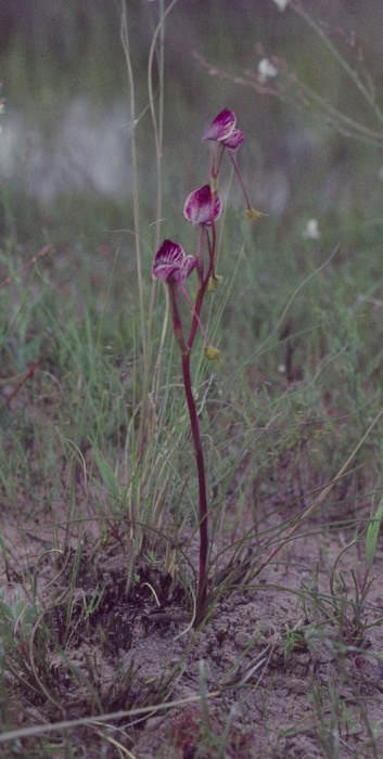 Found in southern Cape Province South Africa, in damp and well drained places on shale and sandstone in full sun at elevations of sea-level to 1200 meters as a miniature to just medium sized, cool to cold growing terrestrial with flat, linear, green leaves that blooms in the spring on an erect, terminal, to 12" [to 30 cm] long, 1 to 4 flowered inflorescence,