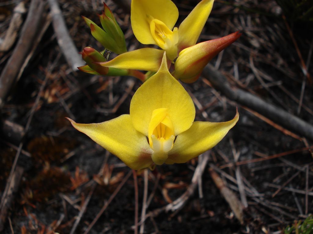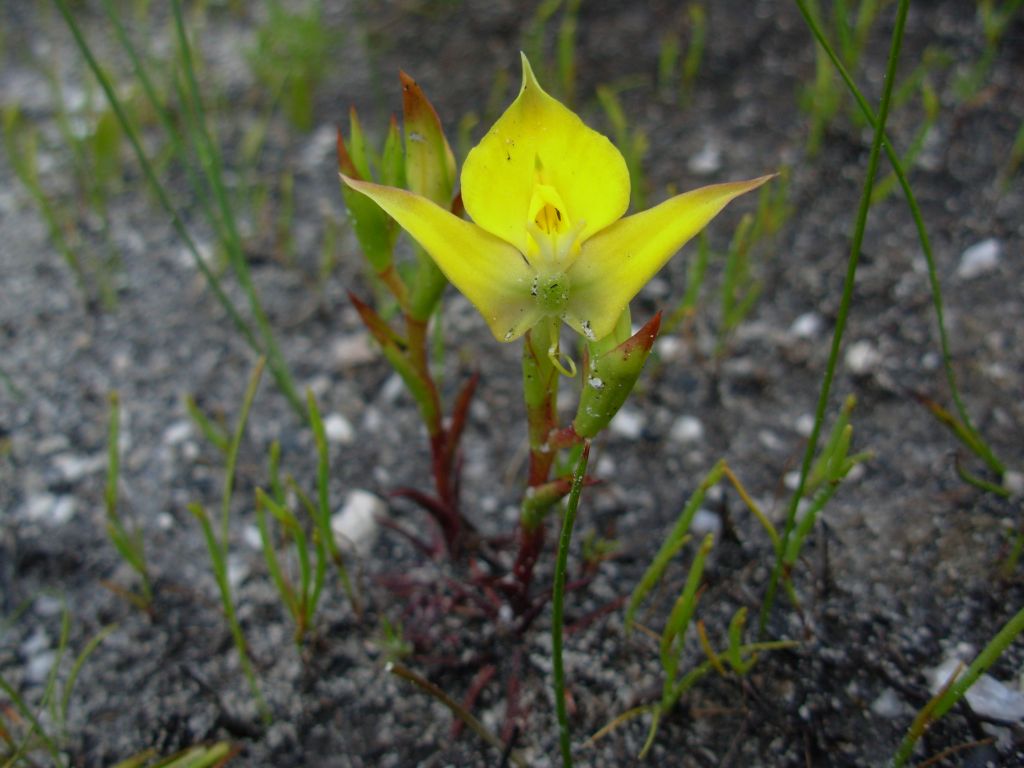 Found in South Africa in damp localities, often in moss at elevations of 500 to 1800 meters as a miniature, cold to cool growing terrestrial plant with dimorphic, imbricate to lax, lanceolate, almost completely sheathing leaves and grading into the numerous, linear radical leaves that blooms in the late spring and early summer on a termial, erect, 4 to 6 flowered, loosely corymbose raceme with narrow sheathing bracts that are shorter than the ovaries. They grow in colonies and really put on a show after a fire has been through.