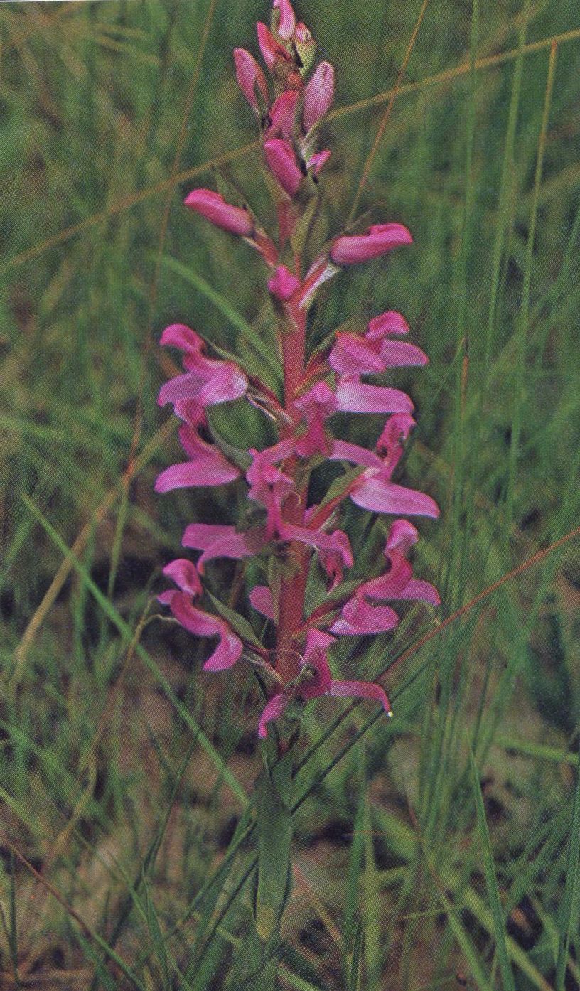 Found in Zaire, Angola and Zambia in wet grasslands and open Uapaca woodlands on grassland verge at elevations around 1000 to 1400 meters as a medium sized, cool growing robust terrestrial with up to 12 sheathing leaves the lowest barred with red, that blooms in the late spring on an erect, fairly lax, 6 to 20 flowered inflorescence carrying bright pink flowers.