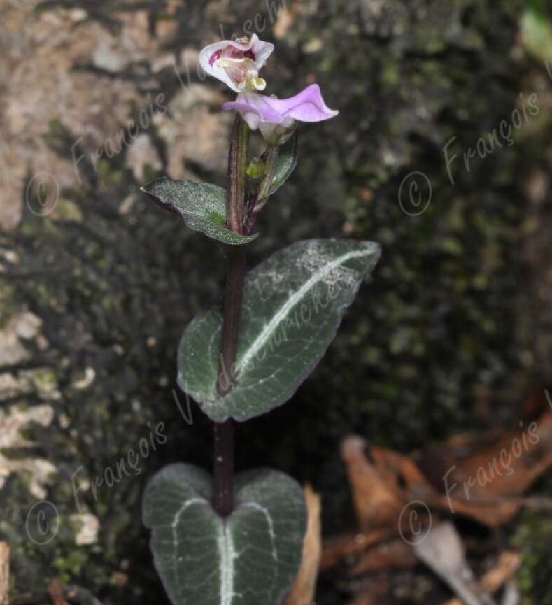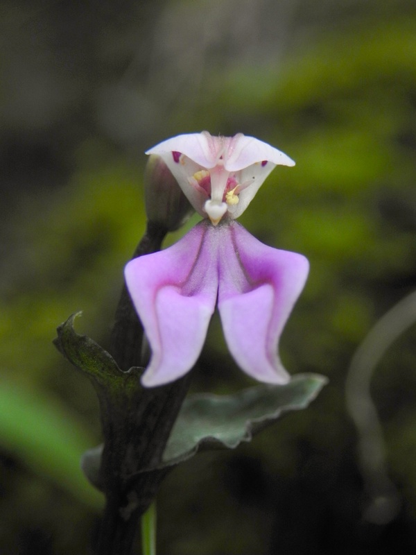 Found in Mauritius, Reunion and Madagascar? as a miniature sized terrestrial with 4 or so, well spaced up the stem, grading smaller above, cordate, dark green, mid rib whitish, acute, basally clasping leaves that blooms in the summer on a terminal erect, 2 to few flowered inflorescence with horizantally held flowers.