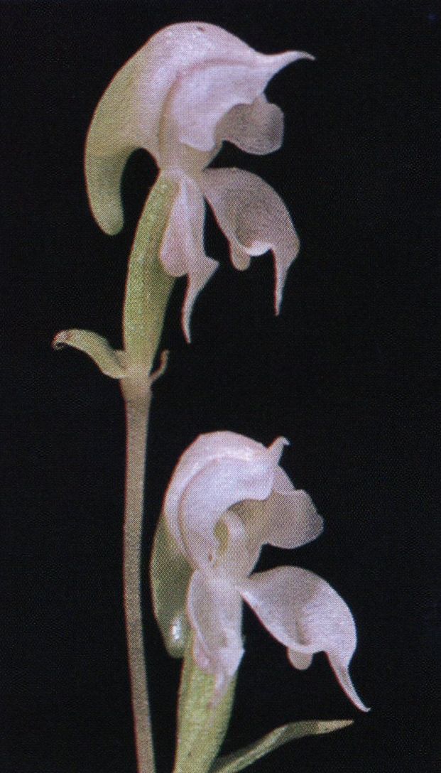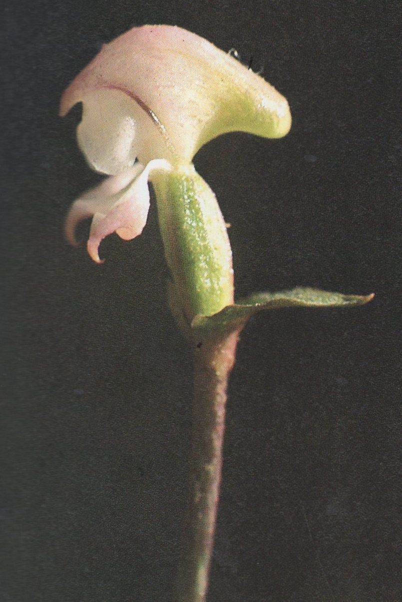 Found in Cape Province, Natal and Transvaal South Africa in shady locations of relatively dry open woodlands at elevations of near sea level to 1770 meters as a mini-miniature sized, cold growing terrestrial with a slender, erect stem carrying 2, cauline, alternate, ovate to broadly ovate, dark green above, purple beneath, acute leves that blooms in the late fall and winter on an erect, terminal, 1 to 7 flowered inflorescence.