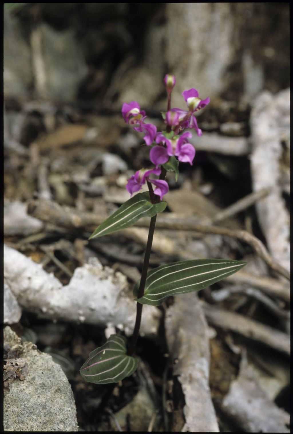 Found in northwestern Madagascar on calcareous rocks and in limestone crevasses in deep shade and leaf detrius at elevations of 30 to 350 meters as a small sized, hot growing lithophtye or terrestrial with an erect stem carrying 2 to 3, distant, sessile, ovate to lanceolate, acute to apiculate, dark green with 3 white-pink lateral veined above and violet below leaves that blooms in the spring through summer on an erect, terminal, several flowered inflorescence