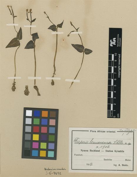 Found in Tanzania, Malawi, Zambia and Zimbabwe in leaf litter in evergreen forests at elevations around 450 to 900 meters as a mini-miniature to just small sized, warm growing terrestrial with globose, more or less hairy tubers with 2, opposite, dark green with silvery-pink veins above, marron-red beneath, clasping base leaves that blooms in the late summer and early fall on an erect, 1 to 3 flowered inflorescence