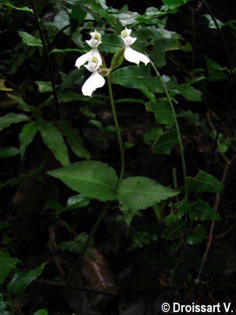 Found in Cameroon as a terrestrial with an erect stem carrying 2, opposite, serrate margined ovate, acute leves that blooms on an erect, 1 to 3 flowered inflorescence .