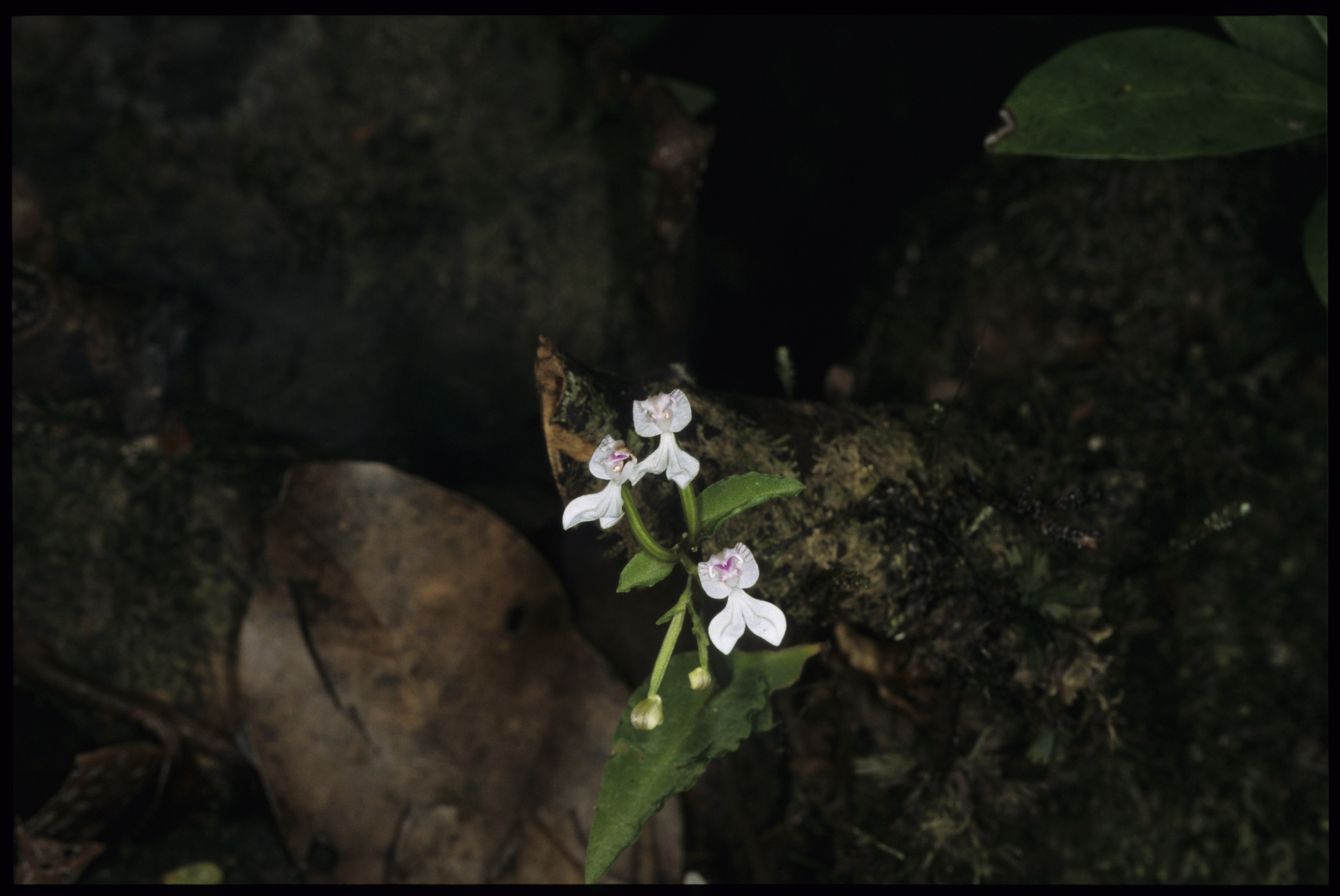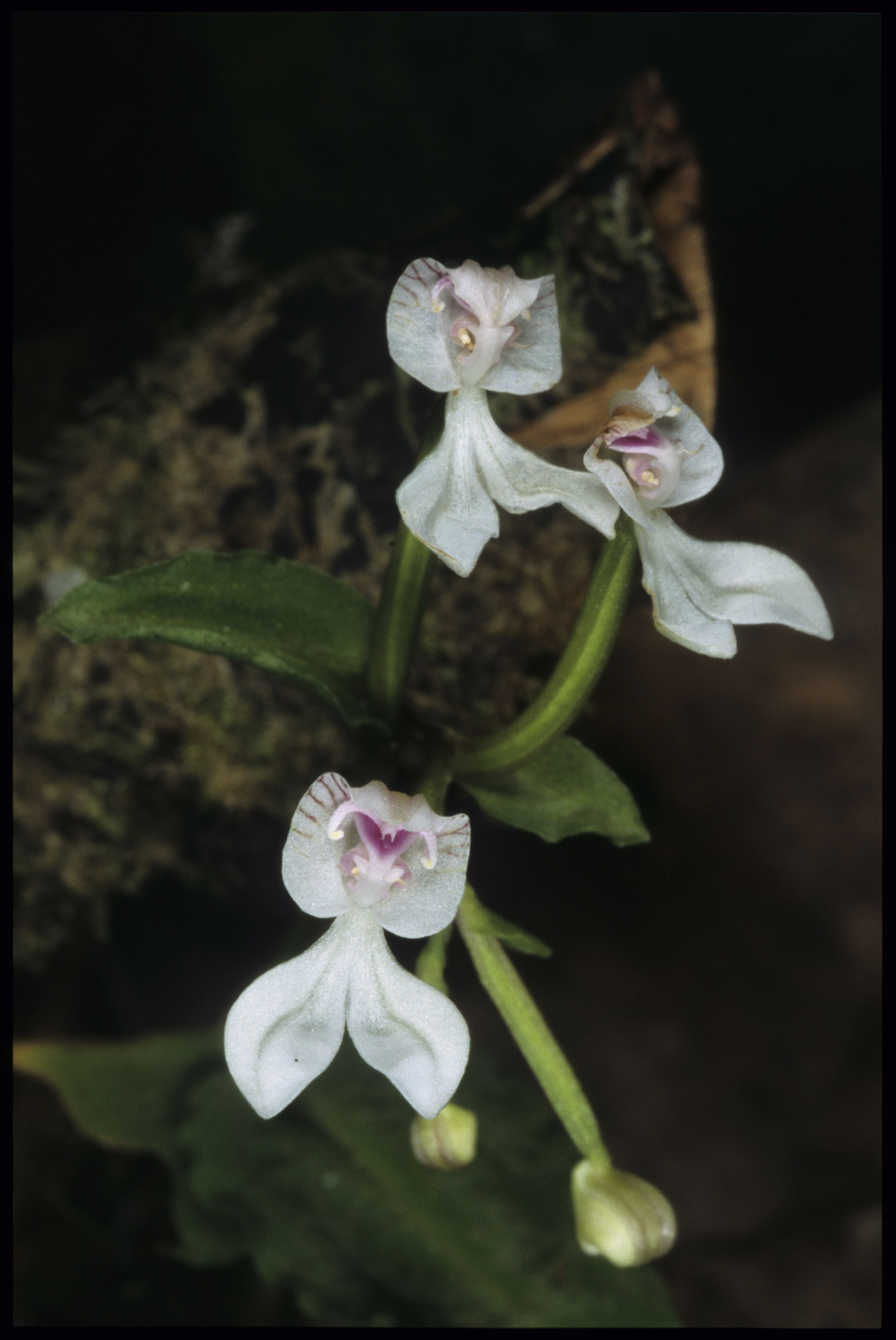 Found in the Comoros, Mauritius, Reunion and Madagascar in humid forests on rocks by streams, at base of trees in moss and in riparian forests at elevations of sealevel to 1500 meters as a miniature to small sized, warm growing terrestrial with an elongate tuber giving rise to a stem carrying 2, opposite, lanceolate to oval-lanceolate, subcordate leaves held above the center that blooms in the winter, spring and summer on an erect, 4 to 10" [10 to 25 cm] long, several flowered inflorescence,